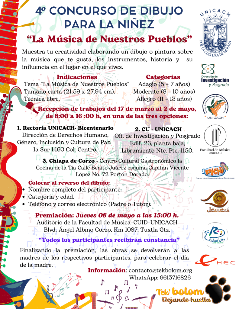 Cordial invitación a participar en el cuarto concurso de dibujo infantil «La Música de Nuestros Pueblos». La obra se recibirá del 17 de marzo al 2 de mayo, de 8:00 a 16 :00 h, en una de las tres locaciones indicadas en el cartel.